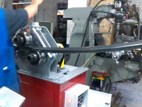 Estas máquinas deforman el tubo o perfil metálico (de acero, aluminio, acero inoxidable, etc.) al hacerlo pasar por tres rodillos (uno superior y dos inferiores). Dependiendo del ajuste de los rodillos, el tubo se curva en un ángulo o radio determinado.